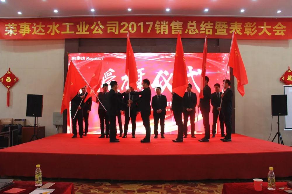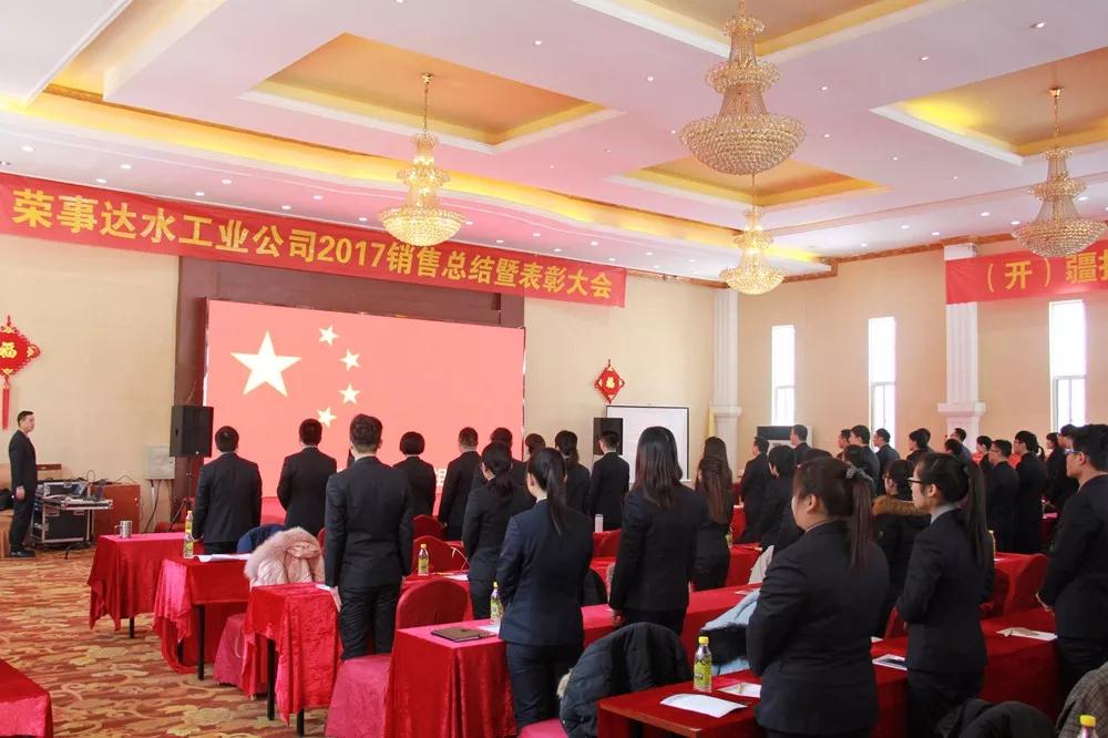 大會開場,榮事達(dá)水工業(yè)公司銷售精英起立合唱《歌唱祖國》,唱響健康中國夢,歌唱屬于自己的凱歌,洪亮的歌聲拉開了“榮事達(dá)水工業(yè)公司2017銷售總結(jié)暨表彰大會”帷幕。