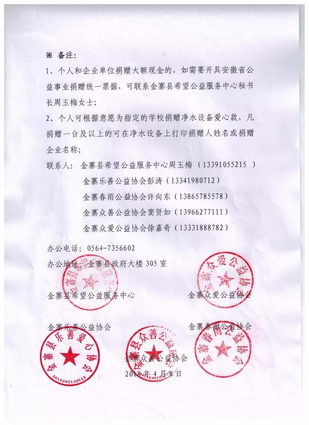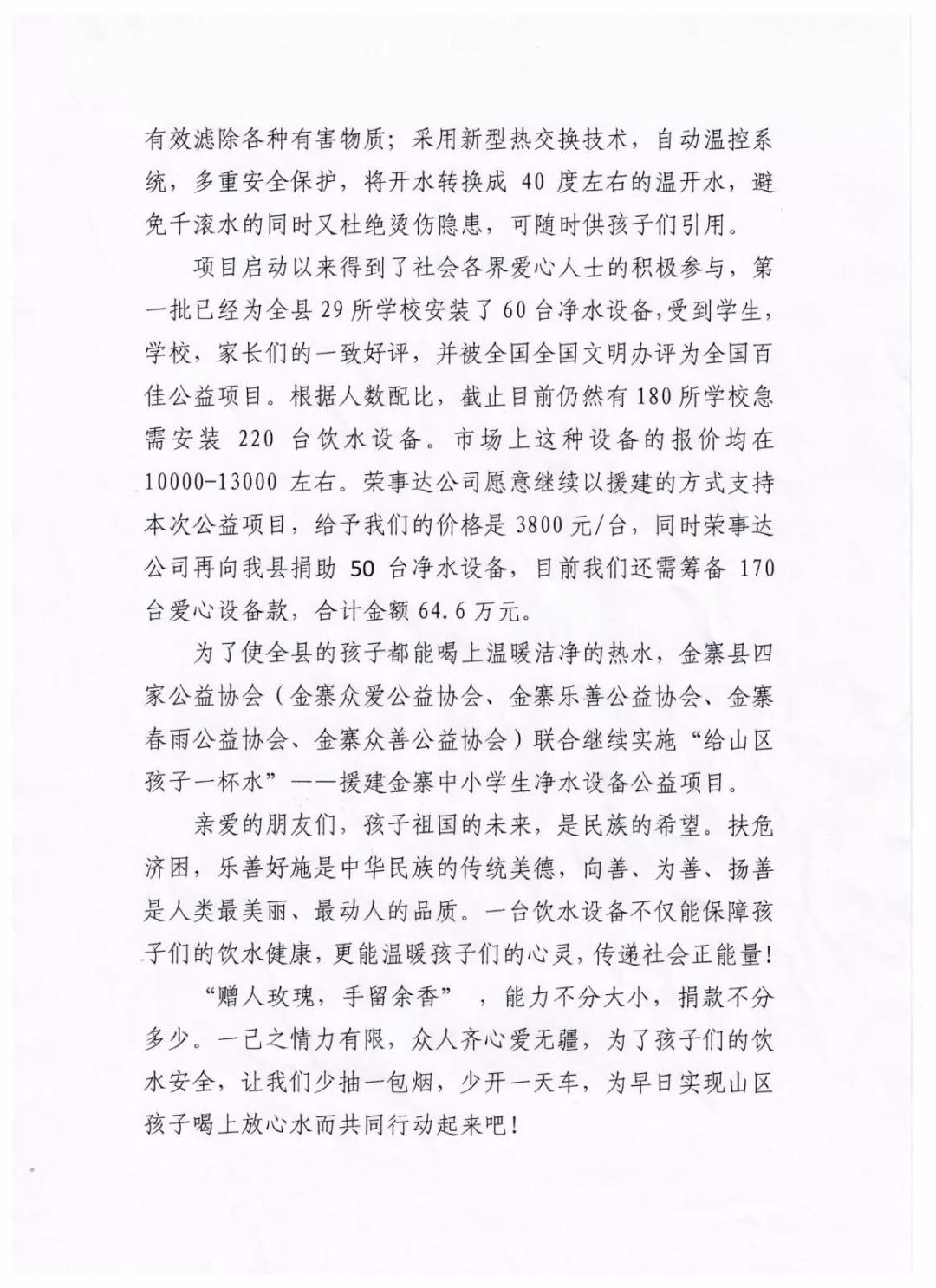 為了使全縣的孩子都能喝上溫暖潔凈的熱水,金寨縣四家公益協(xié)會(金寨眾愛公益協(xié)會、金寨樂善公益協(xié)會、金寨春雨公益協(xié)會、金寨眾善公益協(xié)會)聯(lián)合合肥榮事達水工業(yè)設備有限責任公司繼續(xù)實施“給山區(qū)孩子一杯水”——援建金寨中小學生凈水設備公益項目。