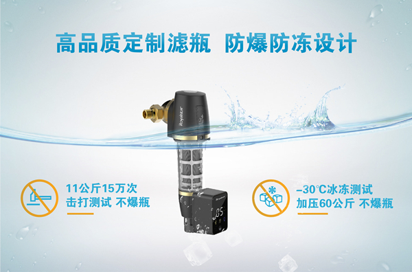 對于傳統前置過濾器來說一直存在一個隱患,那就是在低溫冰凍或是高壓水錘等情況下,容易引發濾瓶爆裂,令許多用戶頭疼不已。其實,回歸根本來說,還是因為濾瓶材質不佳。榮事達為攻克這一難題,可謂是下足功夫。智能前置過濾器濾瓶采用獨特配方和原裝進口材料,不含雙酚A,濾瓶無注塑點,并通過NSFSGS檢測,經過改性配方與防爆防凍極限抗壓測試,11公斤15萬次擊打不爆瓶,-30℃冰凍測試加壓60公斤不爆瓶,濾瓶綜合性能有著質的飛躍,保證用戶使用安心。