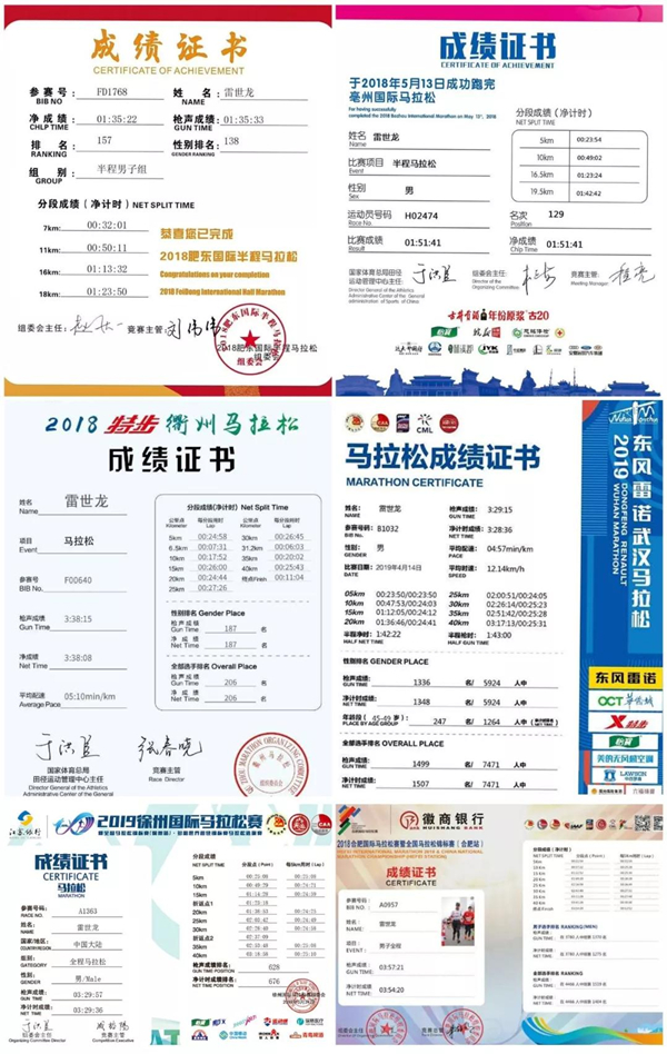 2017年,雷世龍開始接觸馬拉松運動,并加入合肥本地跑團,開始了自己的跑馬生涯。從2017年至今,雷世龍參加了大大小小二十多場馬拉松比賽,足跡遍布全國各地,其中包括多哈世界賽選拔賽徐州馬拉松比賽、中國四大滿貫賽事武漢馬拉松比賽等重要賽事,雷世龍憑借穩定的實力和出色的發揮順利跑完全程并取得了優異的名次。值得一提的是,雖然雷世龍正式接觸馬拉松只有兩年多,但他已成功全馬進入330(即3小時30分鐘內跑完馬拉松全程),獲得精英選手成績,并因此得到國內重要賽事直通名額。“過了今年我就五十歲了,但是我會一直跑下去,我的夢想是完成中國馬拉松大滿貫,我也正為此努力準備著。”