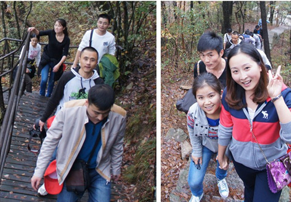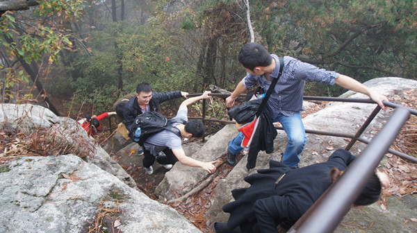 到達目的地用過午餐,全體成員便整裝待發,完成此次拓展訓練最艱難的項目--攀登天屏峰。天屏峰海拔高度1605米,山峰險峻、陡峭無比,全路段多為樹根、石塊堆出的小道,多處攀爬必須手腳并用,甚至要靠隊友幫助,攀登而上極為挑戰體能。