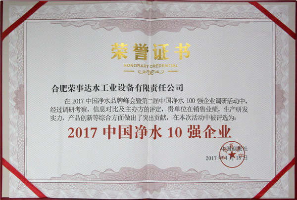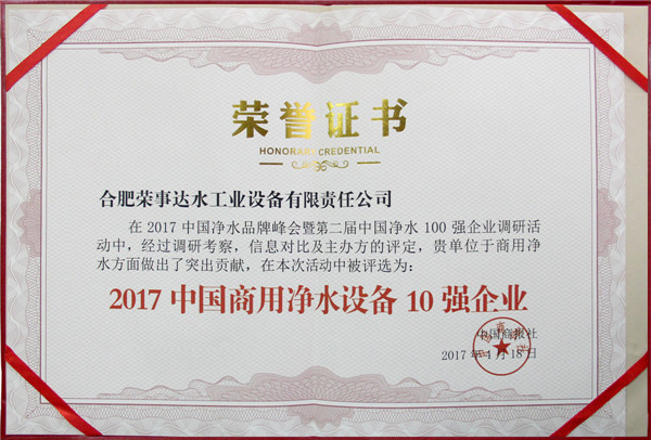•        4月18日,2017中國凈水品牌峰會暨第二屆中國凈水100強企業頒獎盛典在北京維景國際大酒店盛大舉行。榮事達憑借強勁實力和消費者的信賴斬獲“2017中國凈水10強企業”、“2017中國商用凈水設備10強企業”、“消費者滿意品牌”多項大獎。