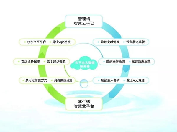 在注重產品品質和工程設計的同時,榮事達著眼校園直飲水的互聯網化建設,依托先進的云端大數據平臺、無線網絡體系和智能一卡通技術等,創新打造校園直飲水智慧管理系統。系統直連凈水主機、開水器、飲水機等終端定制設備,實現精細化管理。學生在使用中不僅能查詢飲水消費記錄、在線報修設備等,還能擁有微信、支付寶等多元化充值方式選擇,充分享受快捷的智能化飲水體驗。同時設備運營商也可通過電腦或手機APP端口接入云數據平臺,異地監測工程運行狀況,實時掌握水電成本、消費收益、設備狀態等數據信息,日常管理更簡單。