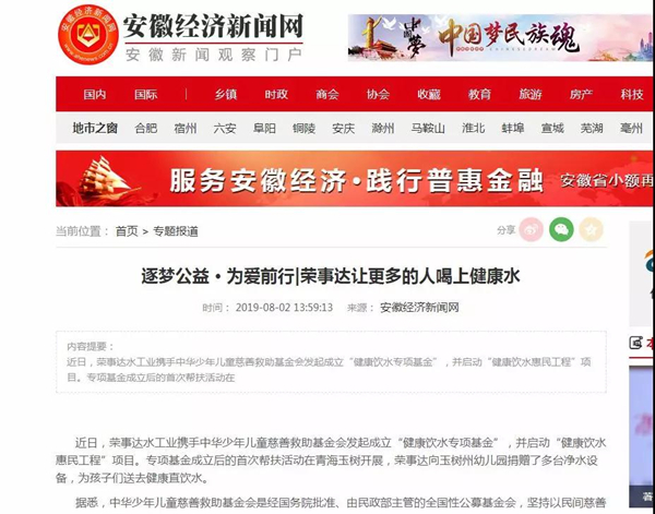 安徽經濟新聞網 《逐夢公益 · 為愛前行|榮事達讓更多的人喝上健康水》