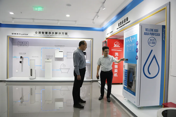 沉浸式參觀,智能凈水工廠實力盡顯 領導一行參觀了榮事達智慧水世界展廳,聽取了集團的發展歷程以及令人矚目的成就,全面了解了社區智慧飲水系統、校園直飲水系統、全屋智慧凈水系統等榮事達十大水處理系統,領導們對公司的綜合實力給予了高度評價與認可。