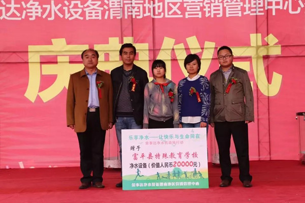 2015年伊始,榮事達(dá)水工業(yè)公司與安徽省青年志愿者協(xié)會(huì)共同發(fā)起了“樂享凈水——讓快樂與生命同在”助殘公益項(xiàng)目,活動(dòng)一經(jīng)發(fā)起就受到了各地代理商的積極響應(yīng),截止目前,累計(jì)向康復(fù)中心、特殊學(xué)校、助殘機(jī)構(gòu)等350多個(gè)單位捐贈(zèng)凈水設(shè)備2000多套,受惠人口超過(guò)50000人。除此之外,代理商們還主動(dòng)為社會(huì)其他人群提供幫助,遼寧遼陽(yáng)代理商就為當(dāng)?shù)丨h(huán)衛(wèi)工人設(shè)置榮事達(dá)飲水站,解決其工作期間的飲水問(wèn)題;江蘇大豐舉行了“關(guān)愛生命,凈享水源”百村助民活動(dòng),當(dāng)?shù)卮砩桃罁?jù)實(shí)際情況為各村鎮(zhèn)服務(wù)機(jī)構(gòu)安裝凈水機(jī),方便村民接水飲用。